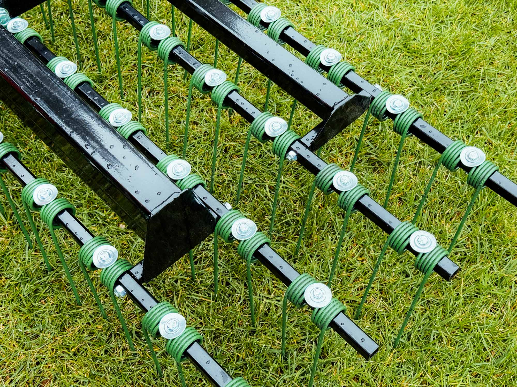 The Heavy Duty Dethatcher uses a heavier duty chassis than the standard 3-point model, plus a bolt-on second row of spring-steel tines ensure ultimate ground contact and makes the HD capable of thatching and collecting more material in tougher conditions than the standard model.